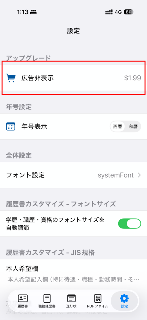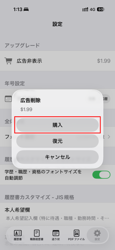 [Screenshot:アプリ内/広告削除(購入)画面]